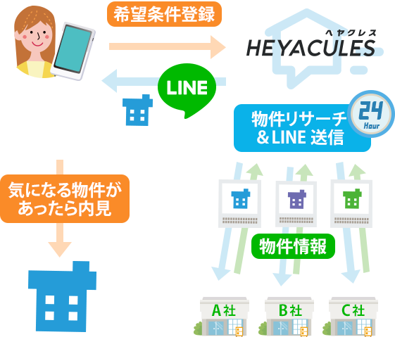 ヘヤクレスはLINEアプリの入ったスマートフォンがあればOK!親指1本でお部屋が探せます。アプリダウンロードが不要なので、WiFiのない環境でも気兼ねなくお部屋探しが始められます。